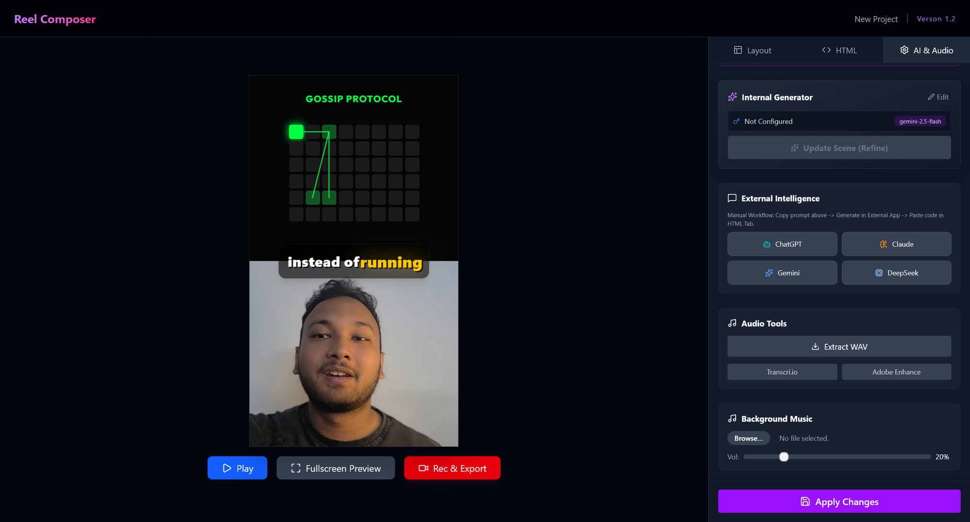 Most tools just add subtitles. Reel Composer understands context. If you say "The server crashed," it doesn't just write the text; it generates a red, glitching terminal animation overlaid on the screen. It uses Gemini 2.0 to direct the visual narrative based on your spoken words.