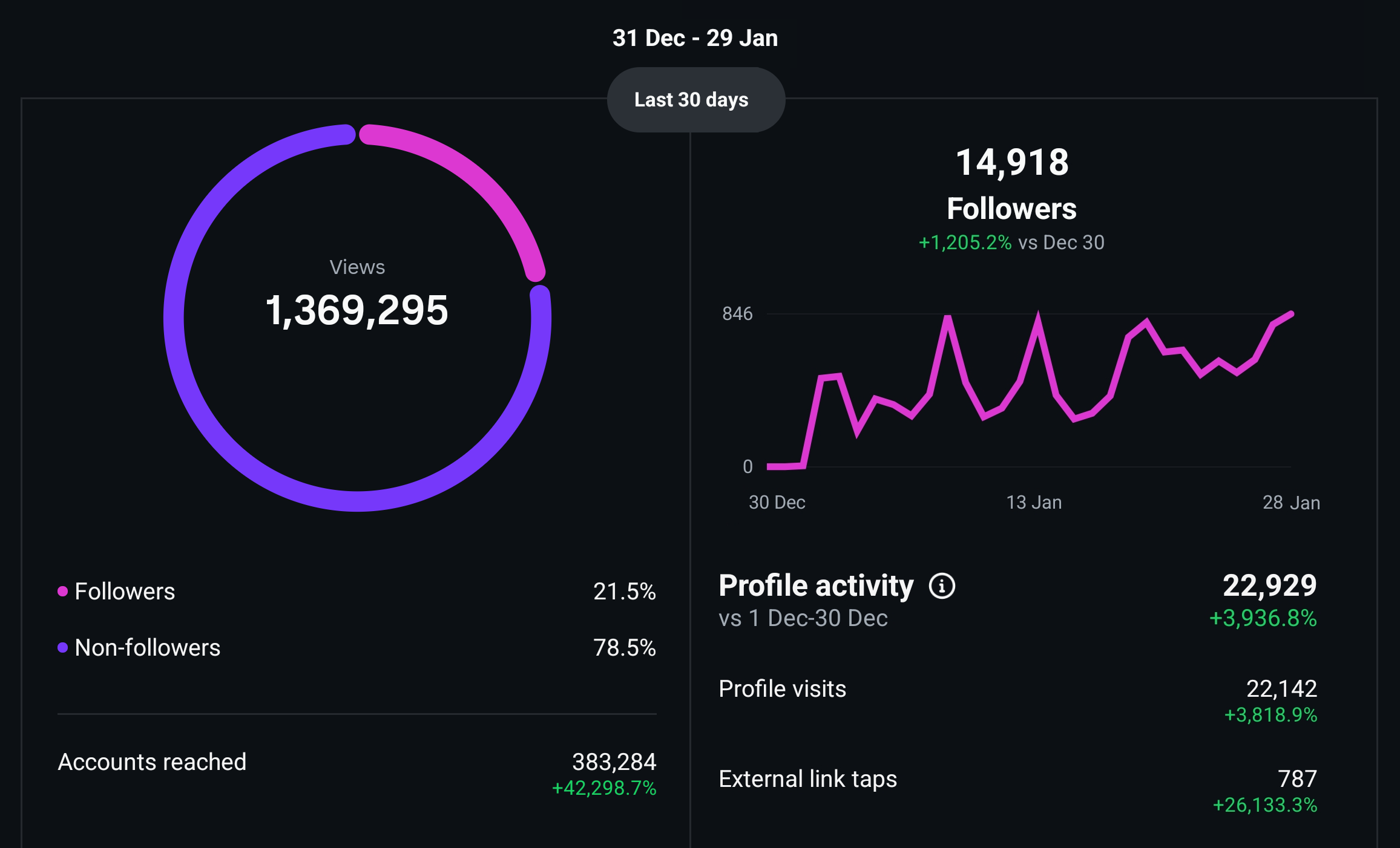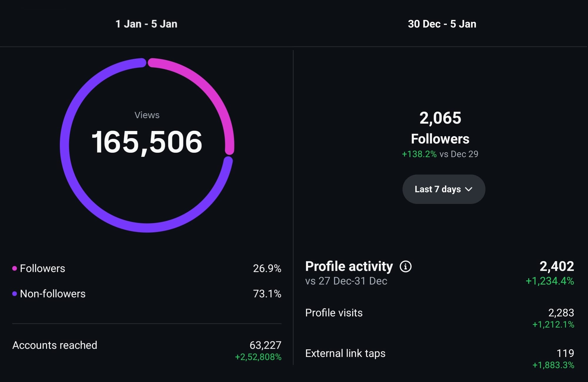 It went from 450 followers to 2000+ in couple of days! from 500-1000 views to 165,506 views!